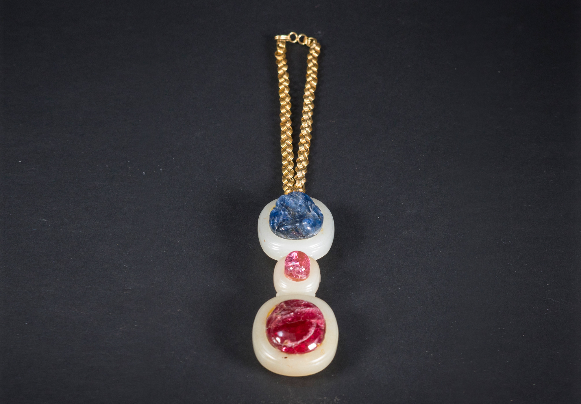 The jade 2 part-buckle is designed as two oval plaques and is held together by a gold chain to assemble a pendant. The upper part of the buckle is inset with a large red tourmaline. At the belt hook there is a pink tourmaline, and the lower part of the buckle is inset with a large blue tourmaline. The chain is antique 18 carat gold made in Russia. There are a few small chips in the red and blue tourmaline.