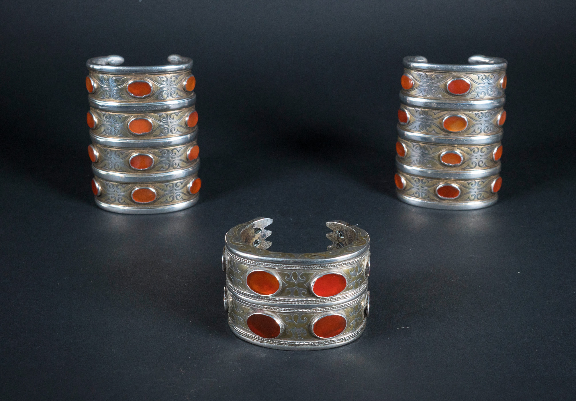 The cuffs are fire gilded and bold with carnelian stones embedded in Islamic patterns.