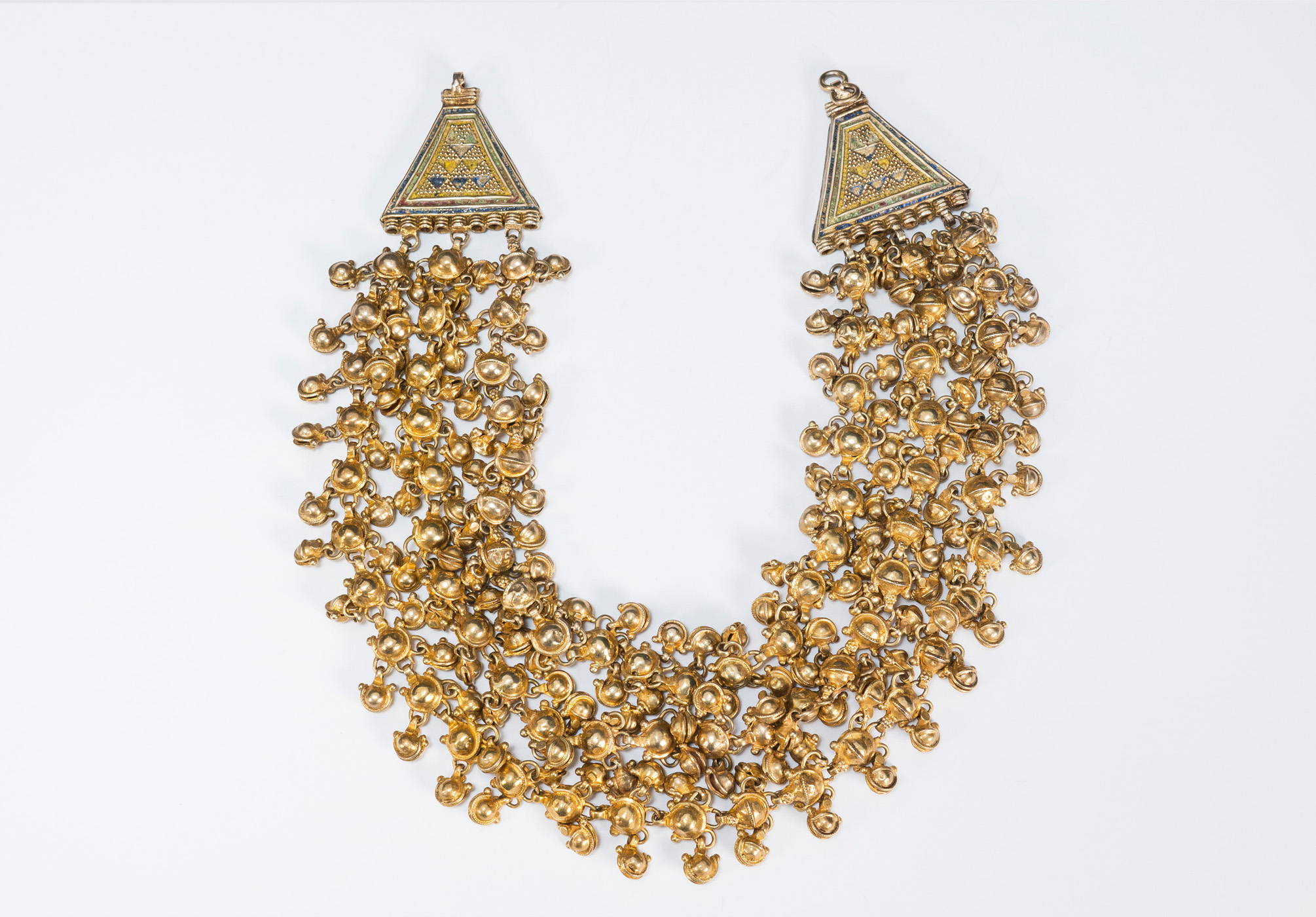 This choker has 3 large rows of 3-sided bells with pyramid shaped clasp overlaid in gold and enamel.