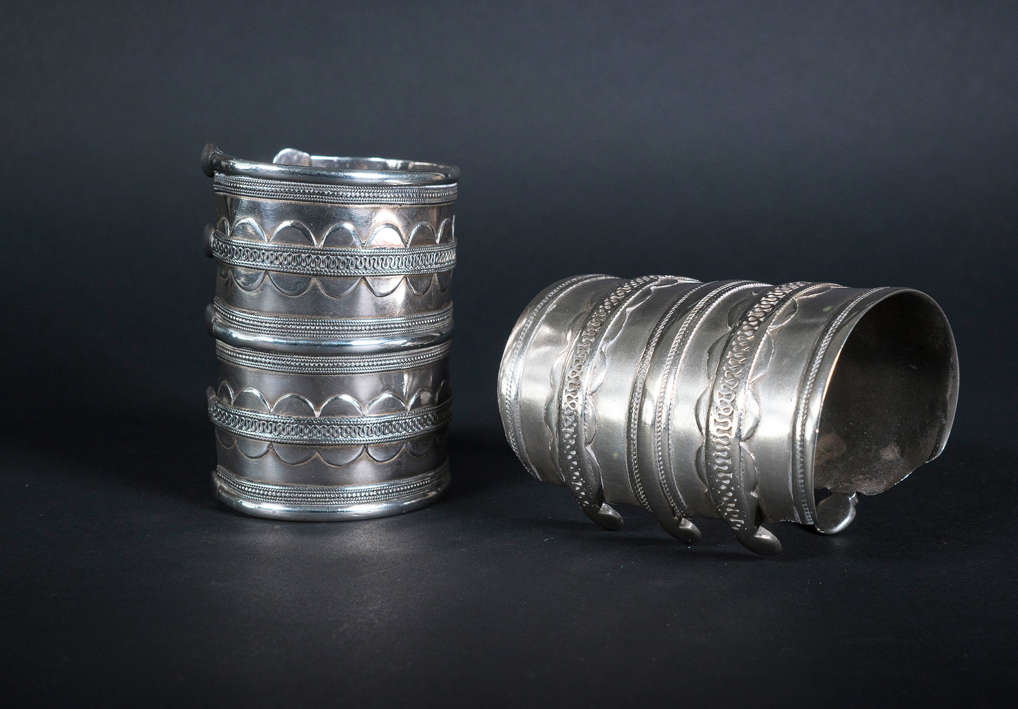 The Olami Cuff from Central Asia is a rare style of the Turkmen cuff and characterized by the absence of fire-gilding. The double band design is embellished in oval circles with rows of twisted wires inside the circle. The design of each cuff is quite similar. Both bracelets have the ends of the so-called lobster′s claw.