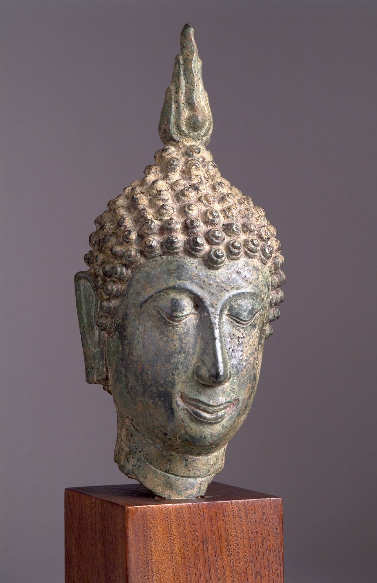 This commanding head of Buddha is a good example of the 14th century in the Sukhotai Kingdom of North-Central Thailand. The Buddha has heavily-lidded downcast eyes with finely arched eyebrows, a prominent nose, and slight smile. His hair is beautifully aligned in delicate small snailshell curls and topped with a flame- form finial. The ears are fragmented and his head is finely polished.
